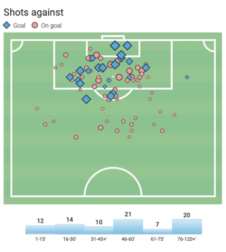 如果现在再回看迪亚斯的参与进球和参与制造得分机会完整点位图,你会发现,迪亚斯最有威胁的时间主要集中在下半场前半段和后半段,这两个足球比赛尤为关键的时期。本赛季,拜仁在落后或胶着的比赛中,迪亚斯贡献7球4助,独造11球,占球队胶着局进球数的42%。迪亚斯的所有数据,都是在全德甲所有球员压力值最大的情况下取得的,即便这样他竟然只是本赛季德甲场均评分第二的左边锋,但所有数据都能证明迪亚斯有一颗大心脏。