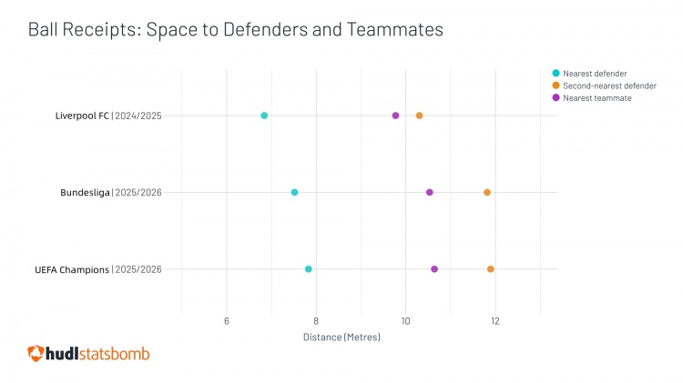 对比利物浦时期,迪亚斯在利物浦时期练就的高位逼抢意识,在孔帕尼的战术体系下得到完全释放。孔帕尼将迪亚斯的空间价值放大到了极致!通过球权接收:迪亚斯与防守球员的空间距离对比图可以清晰看见,迪亚斯在利物浦时期参与了更多防守,与防守球员的距离也更近,踢左边锋时更多地要保持随时联防的状态。而在孔帕尼麾下,迪亚斯回防深度大幅收缩,始终保持和队友足够的空间,这才有一次次获得单刀的机会,这在以往是迪亚斯并不擅长的,相信假以时日,迪亚斯的单刀水平也会大大提升。